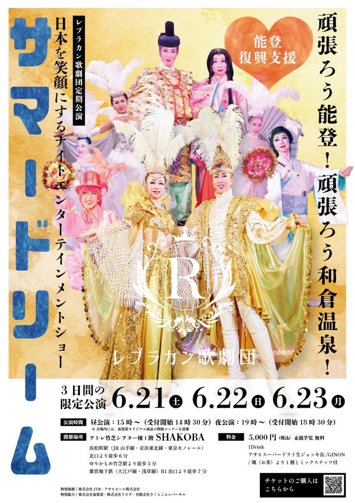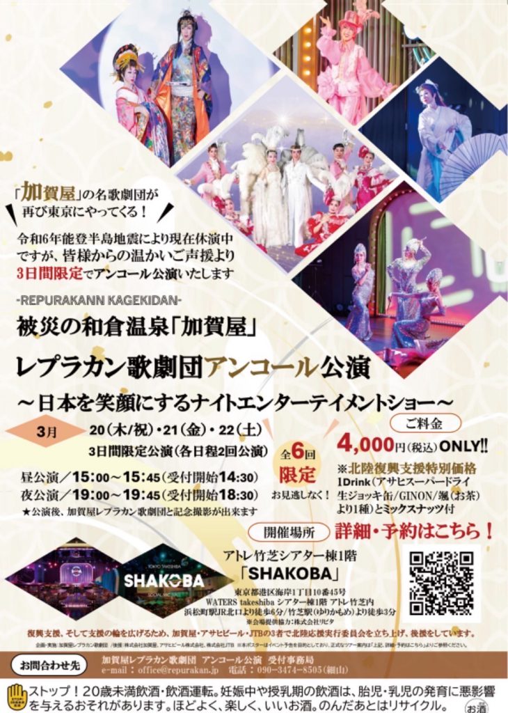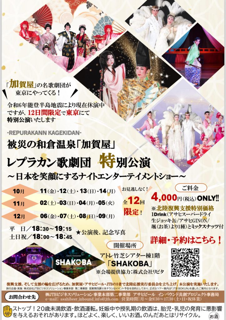 加賀屋、アサヒビール、JTBの協業プロジェクトである「上質なナイトタイムエコノミーの創出」の一環として「加賀屋レプラカン歌劇団」ナイトタイムショーを竹芝「shakoba」にて公演実施
